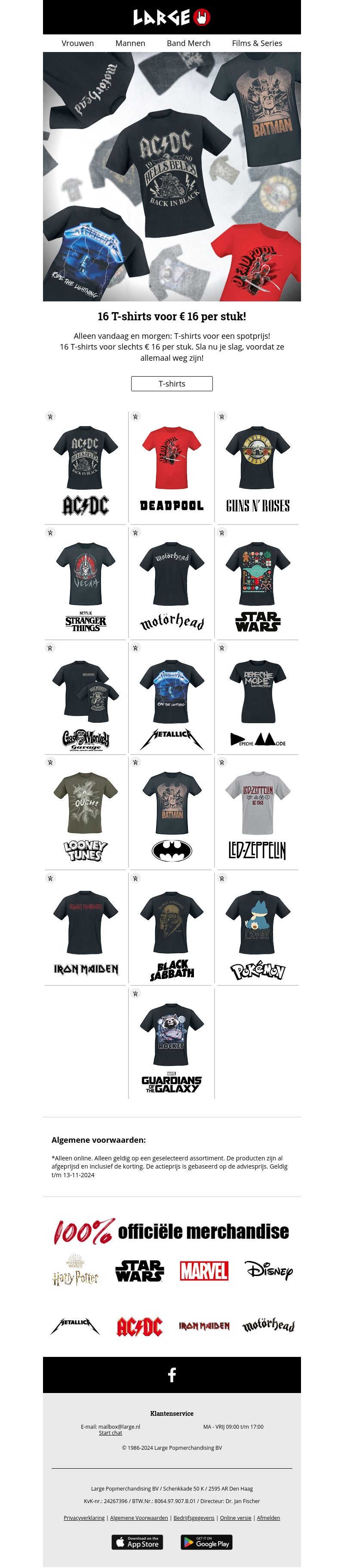 Ontdek een geweldige selectie van officiële band T-shirts voor maar €16 per stuk. Van AC/DC tot Metallica, kies uit je favoriete bands en films met deze exclusieve deal van Large. Wees er snel bij, want de aanbieding is slechts beperkt geldig!