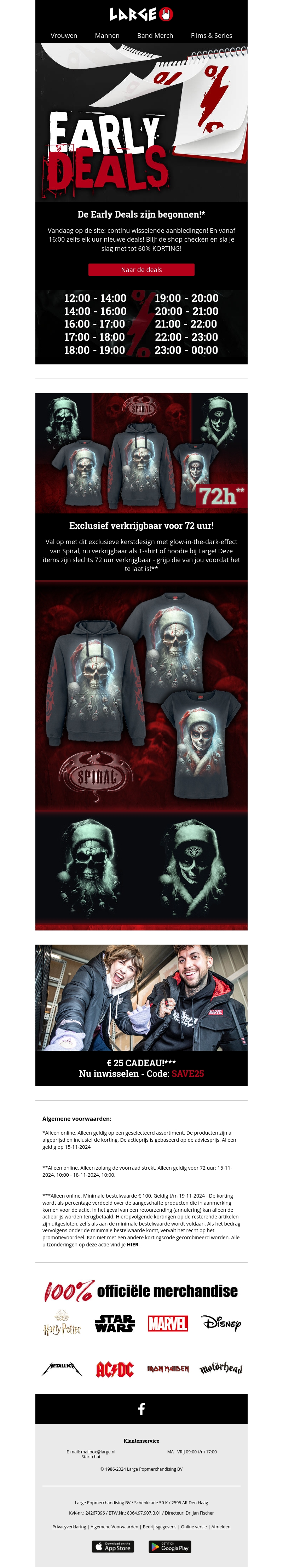 De Early Deals zijn van start gegaan bij Large.nl! Ontdek elk uur nieuwe aanbiedingen en scoor tot wel 60% korting op exclusieve merchandise. Vergeet niet je favorieten in de winkelmand te plaatsen voordat de deals verdwijnen. Grijp nu je kans en pak unieke items van Spiral met een glow-in-the-dark effect. Gebruik je code SAVE25 voor extra voordeel!
