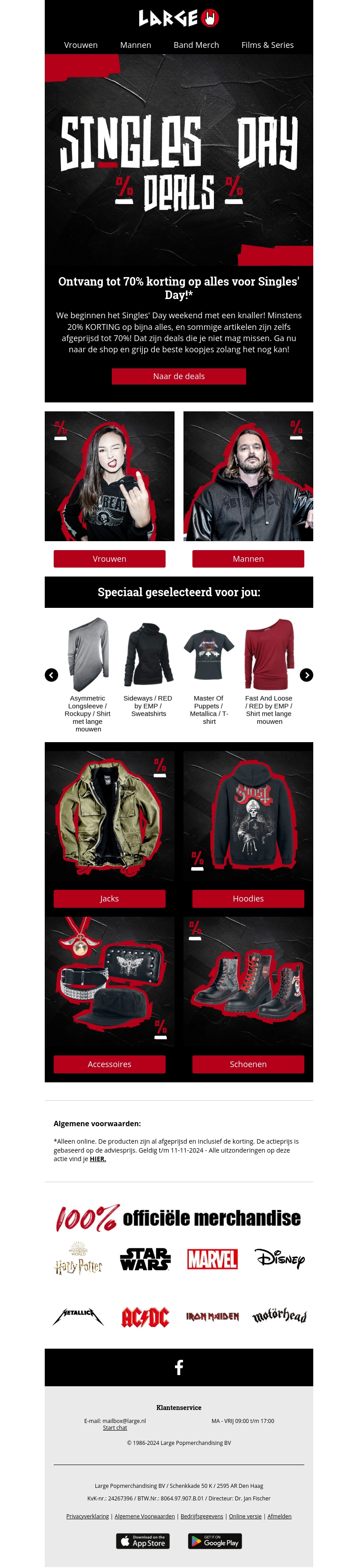 Vier Singles' Day bij Large met spectaculaire kortingen tot wel 70% op alles. Ontdek een exclusieve selectie van kleding, accessoires en meer voor zowel mannen als vrouwen. Slechts beperkte tijd beschikbaar, dus mis het niet!