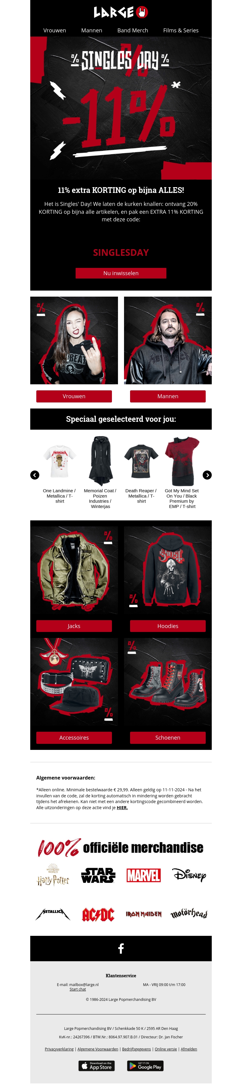Vier Singles' Day met spectaculaire kortingen op een breed scala aan producten. Profiteer alleen vandaag van 11% extra korting op bijna alles. Van kleding tot accessoires, iets voor iedereen! Ontdek geweldige deals op officiële merchandise van je favoriete merken. Vergeet niet de code SINGLESDAy in te wisselen bij de kassa.