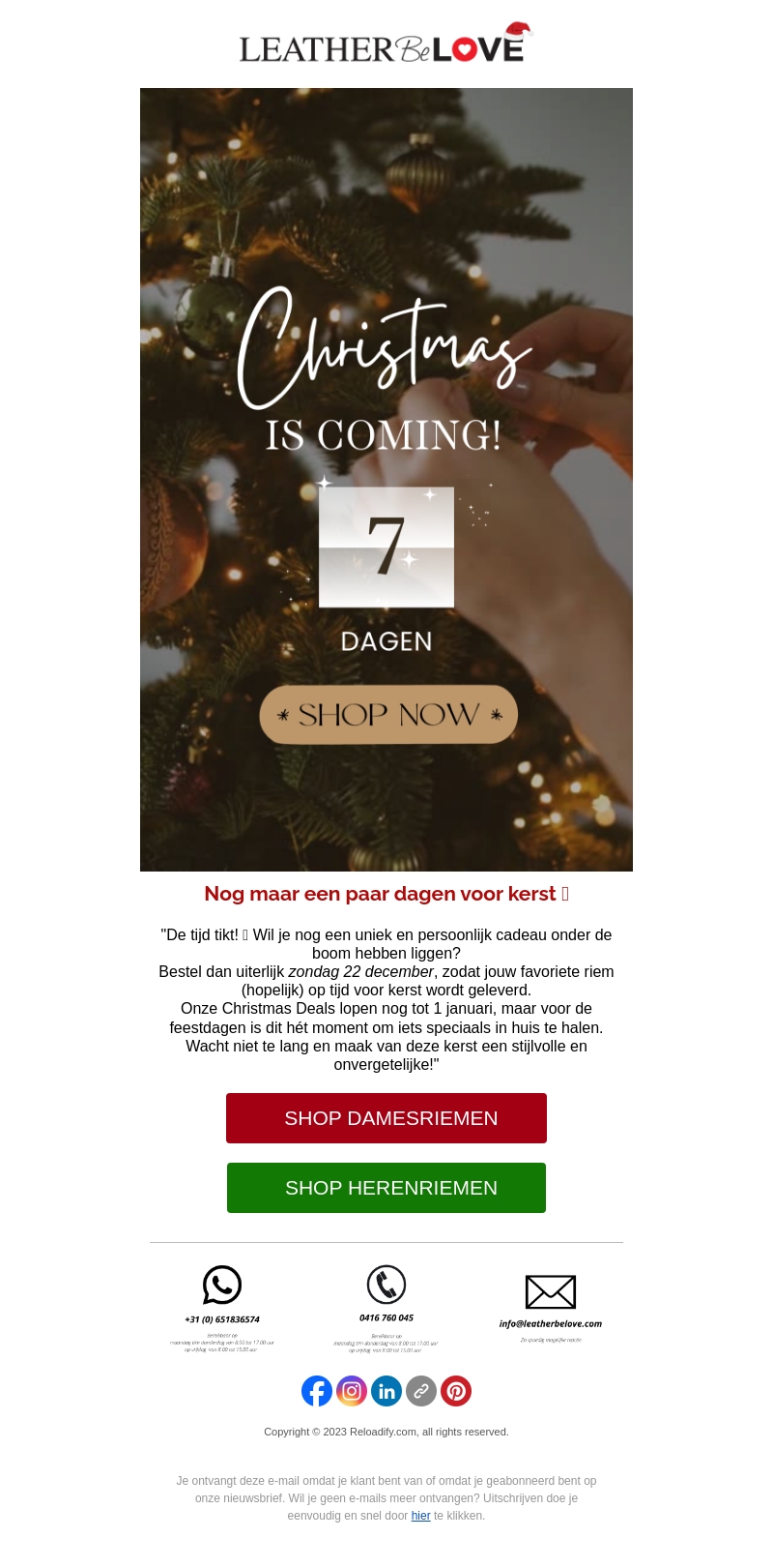 De feestdagen komen eraan en wij hebben de perfecte deals voor jou! Bestel jouw favoriete riemen voor zondag 22 december om op tijd te kunnen genieten van een uniek en persoonlijk kerstcadeau. Onze Christmas Deals lopen tot 1 januari. Mis deze kans niet en maak je vakantie onvergetelijk met stijlvolle accessoires.