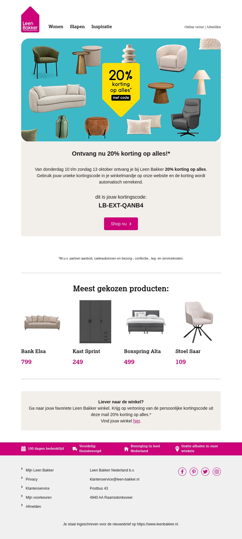 Van 10 tot en met 13 oktober ontvang je bij Leen Bakker 20% korting op alles. Gebruik de unieke kortingscode in je winkelmandje om de korting te verrekenen. Bekijk de meest gekozen producten zoals Bank Elsa, Kast Sprint, en meer. Bezoek ook je favoriete winkel voor persoonlijk advies.