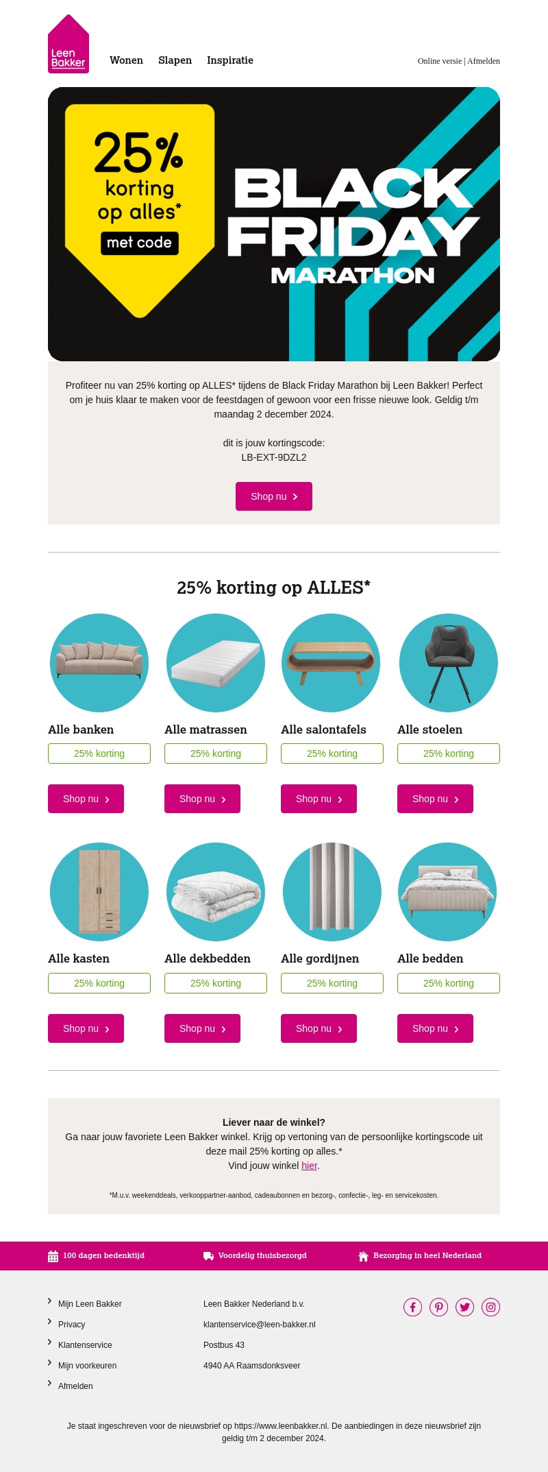 Ontdek de geweldige Black Friday Marathon bij Leen Bakker met 25% korting op alles. Perfect voor het vernieuwen van je interieur voor de feestdagen. Actie geldig tot 2 december 2024. Gebruik de kortingscode voor extra voordeel. Mis deze kans niet om jouw favoriete items voordelig te shoppen.