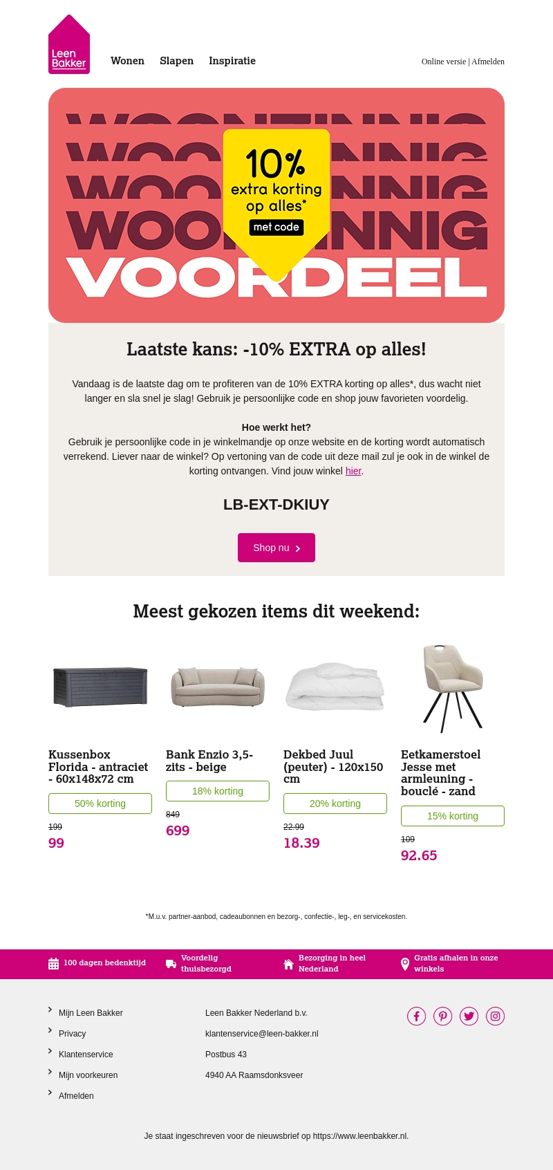 Mis de kans niet op 10% extra korting op het volledige assortiment van Leen Bakker. Gebruik je persoonlijke kortingscode voordat de actie morgen eindigt. Shop nu en bespaar op je favoriete items, zowel online als in de winkel. Bekijk onze meest gekozen producten van dit weekend met kortingen tot 50%.