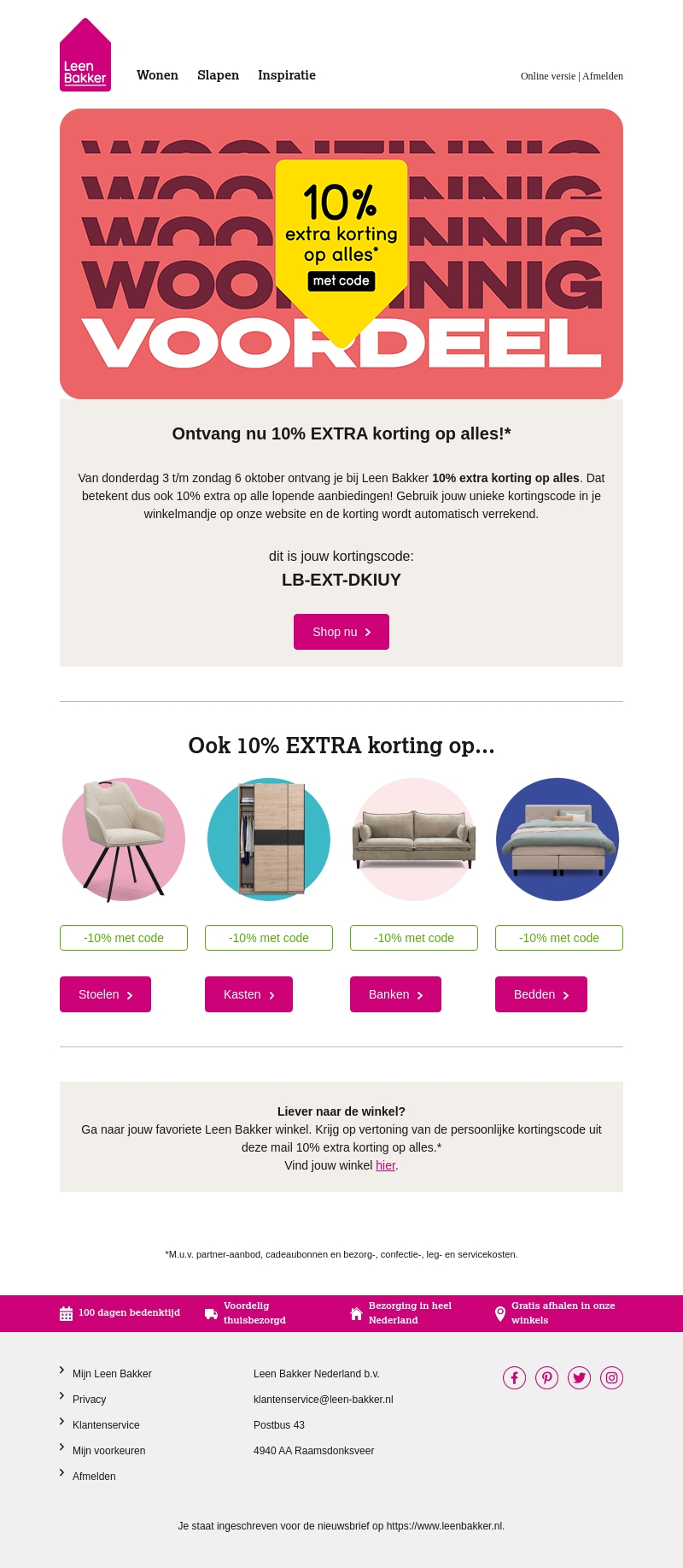 Van donderdag tot en met zondag krijg je bij Leen Bakker 10% extra korting op alles. Deze aanbieding geldt ook op lopende kortingen. Gebruik de unieke kortingscode tijdens het afrekenen op onze website en de korting wordt automatisch verrekend. Mis deze kans niet om je favoriete items nog voordeliger te scoren. Sla snel je slag!