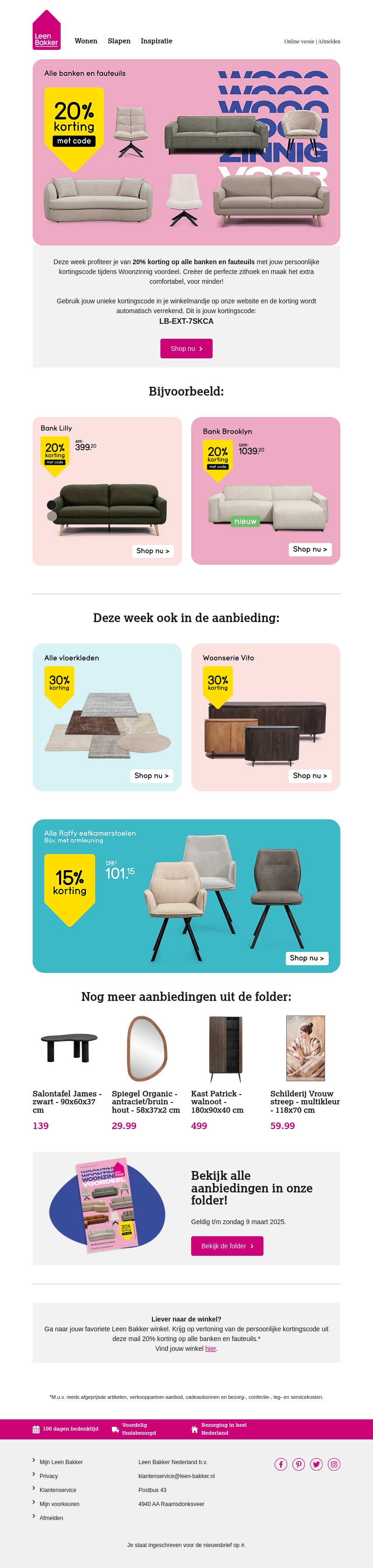 Deze week biedt Leen Bakker een fantastische kans om 20% te besparen op alle banken en fauteuils. Of je nu op zoek bent naar een nieuwe bank of een stijlvolle fauteuil, dit is het perfecte moment om te kopen. Met een unieke kortingscode krijg je extra voordeel, zowel online als in de winkel. Daarnaast zijn er ook geweldige aanbiedingen op vloerkleden en woonseries. Mis deze kans niet en bezoek de Leen Bakker winkel of website vandaag nog!