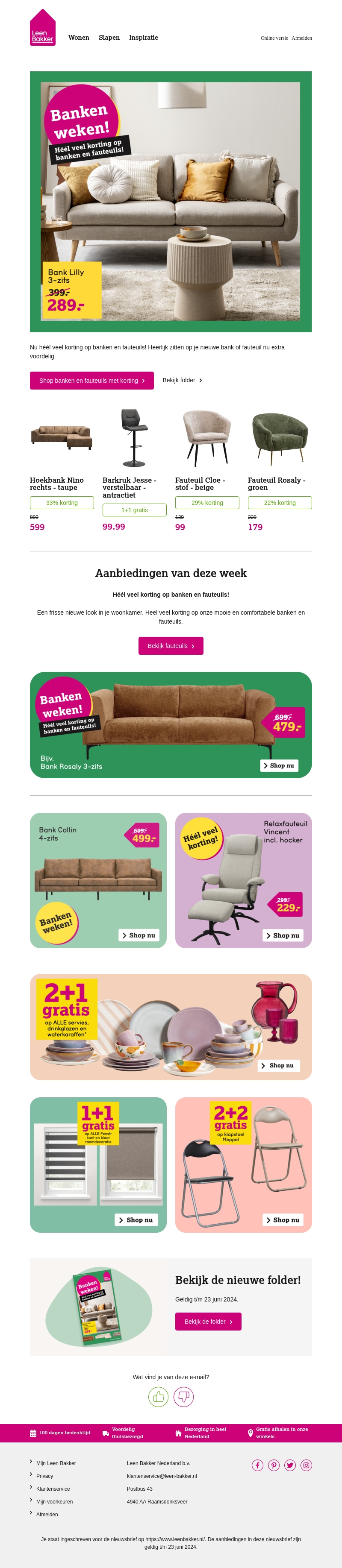 Profiteer nu van de Banken weken bij Leen Bakker met heel veel korting op banken en fauteuils. Verfraai je woonkamer met onze stijlvolle en comfortabele meubels tegen een aantrekkelijk prijs. Bezoek onze website voor de beste aanbiedingen van deze week. Mis het niet en bekijk nu onze folder voor nog meer deals. Geldig tot 23 juni 2024!