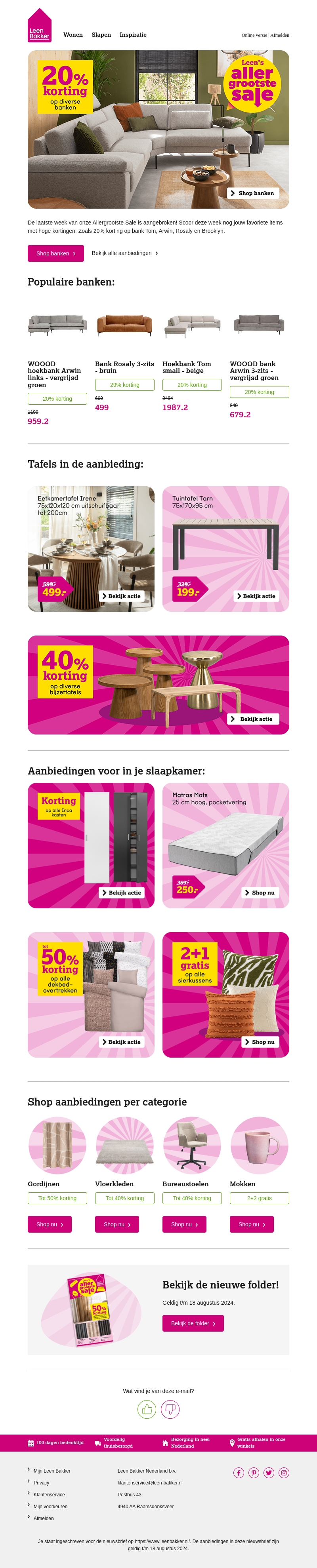 De laatste week van onze Allerbeste Zomerdeals is aangebroken! Profiteer nu van hoge kortingen op je favoriete items zoals banken, tafels, en slaapkamerartikelen. Mis deze kans niet om je huis in te richten met stijlvol meubilair tegen scherpe prijzen.