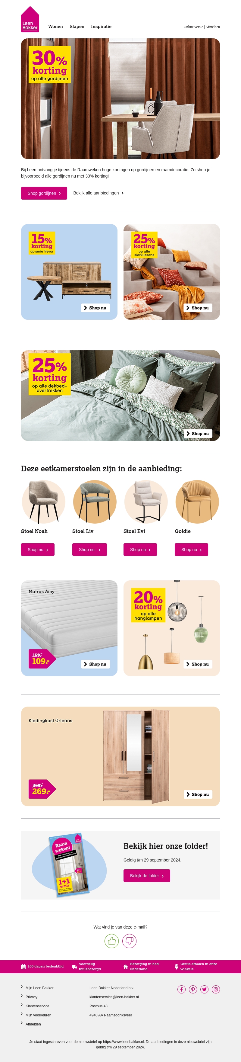 Mis deze kans niet! Bij Leen Bakker ontvang je tijdens de Raamweken hoge kortingen op gordijnen en raamdecoratie. Zo shop je bijvoorbeeld alle gordijnen nu met 30% korting. Daarnaast zijn er ook kortingen op tafels, kussens, dekbedovertrekken, eetkamerstoelen, matrassen, hanglampen en kledingkasten.