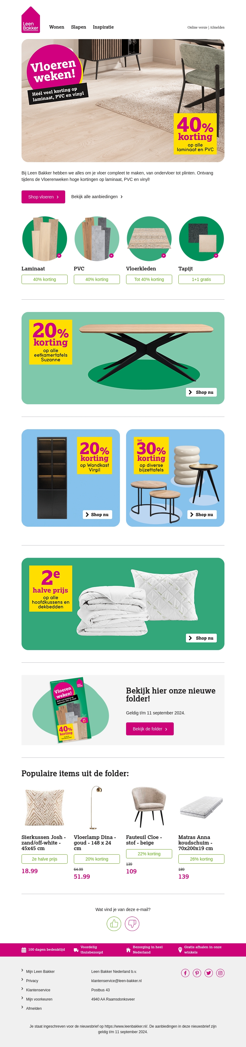 Bij Leen Bakker is het Vloerenweken! Geniet nu van héél veel korting op laminaat, PVC en vinyl vloeren. Ook andere vloerkleden en tapijten zijn scherp geprijsd. Ontvang tot 40% korting op geselecteerde producten en 1+1 gratis aanbiedingen. Bezoek onze winkel of kijk online voor meer aanbiedingen.