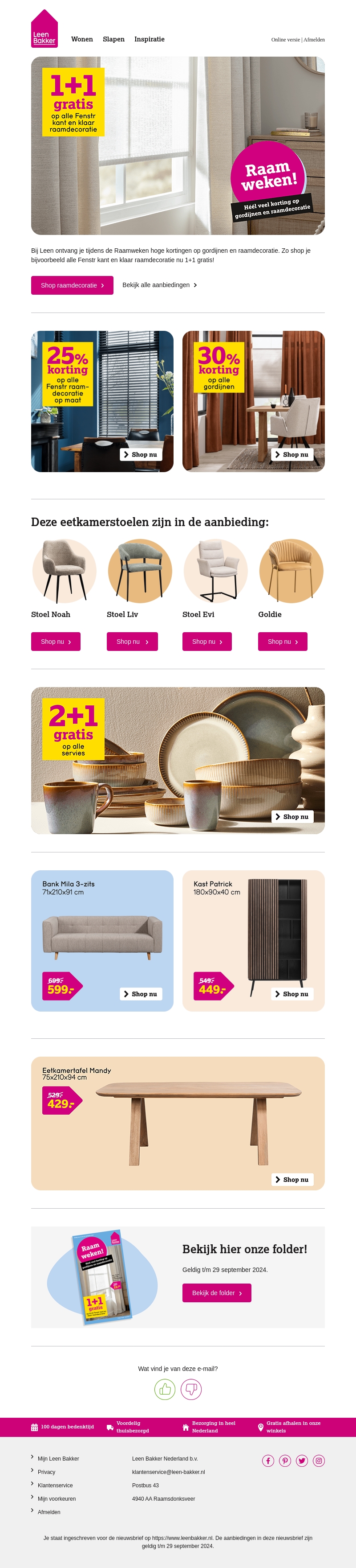 Bezoek Leen Bakker tijdens de Raamweken voor geweldige aanbiedingen op gordijnen en raambekleding. Profiteer van 1+1 gratis op alle Fenstr kant-en-klaar raambekleding. Ontdek onze eetkamerstoelen aanbiedingen en mis de extra kortingen op maat gemaakte en kant-en-klare producten niet. Bekijk ook onze folder voor meer aanbiedingen, geldig tot 29 september 2024.
