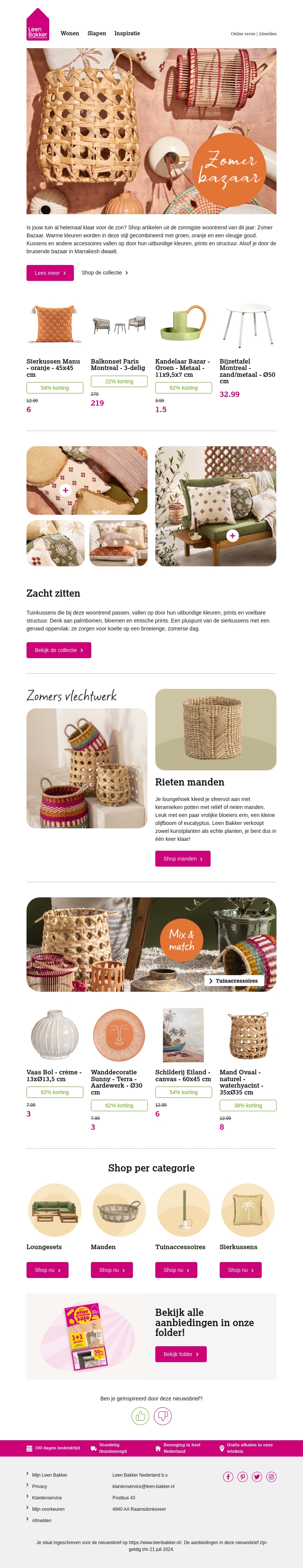 Is jouw tuin klaar voor de zon? Shop de nieuwste zomerse woontrends bij Leen Bakker. Van kleurrijke kussens tot stijlvolle meubels, je vindt alles om je tuin om te toveren tot een zomers paradijs. Ontdek onze collectie en profiteer van kortingen tot wel 54%.