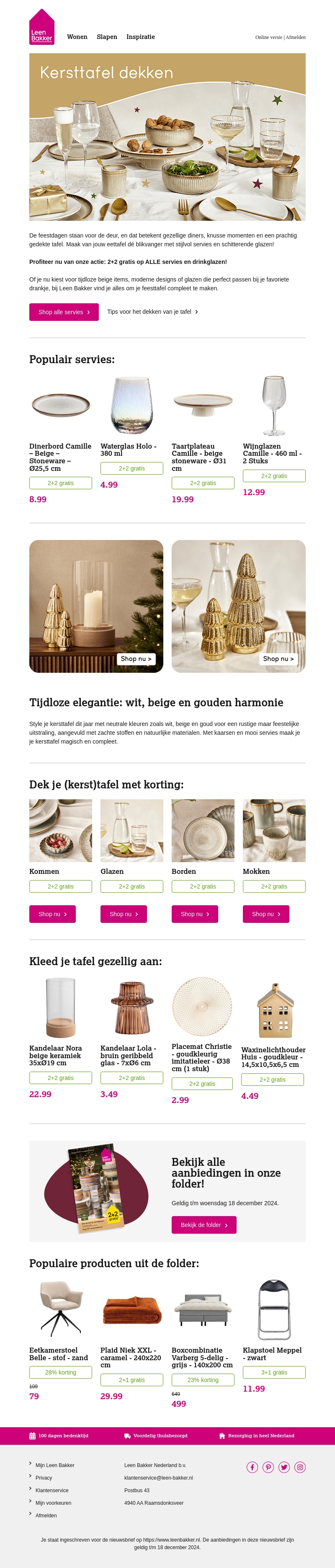 Bereid je voor op de feestdagen met een stijlvol gedekte tafel. Leen Bakker biedt een breed scala aan servies, glazen, kandelaars en meer om je eettafel te laten stralen. Profiteer van de 2+2 gratis actie op alle servies en drinkglazen. CreΓ«er een warme en feestelijke sfeer met neutrale tinten en gouden accenten.
