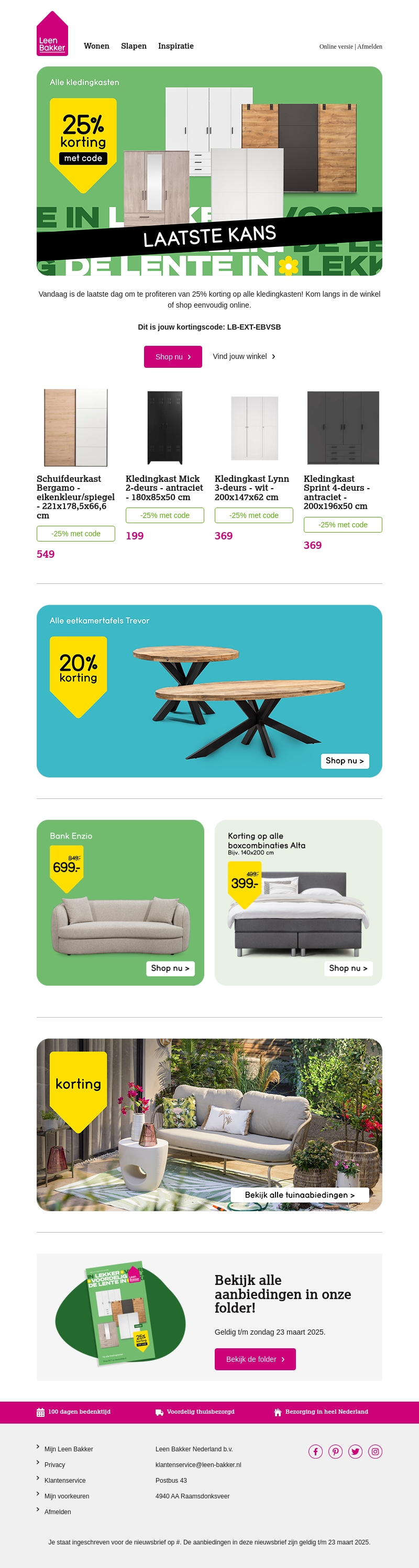Ontdek de laatste kans op een geweldige korting bij Leen Bakker! Vandaag ontvang je 25% korting op alle kledingkasten. Deze aanbieding is perfect om jouw interieur een stijlvolle upgrade te geven. Wacht niet te lang, want dit is een tijdelijke actie. Haast je naar de winkel of shop online en benut dit uitzonderlijke aanbod. Verras jezelf met prachtige kledingkasten voor een aantrekkelijke prijs.