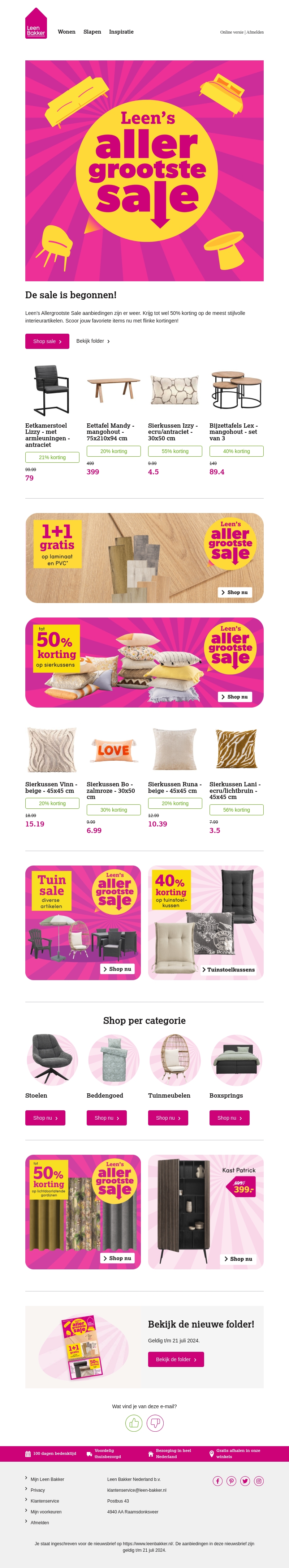 Leen's allergrootste sale is begonnen! Profiteer van kortingen tot 50% op stijlvolle interieurartikelen. Scoor je favoriete items nu met flinke kortingen. Van eetkamerstoelen tot sierkussens, er is voor ieder wat wils. Mis deze geweldige aanbiedingen niet en bekijk onze folder.