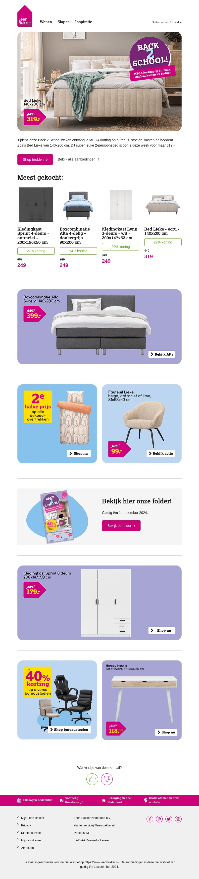 Profiteer nu van mega kortingen op bureaus, stoelen, kasten en bedden bij Leen Bakker tijdens de Back 2 School weken! Sla je slag met speciale aanbiedingen zoals Bed Lieke en diverse kledingkasten. Mis deze kans niet en bekijk alle acties in onze folder.