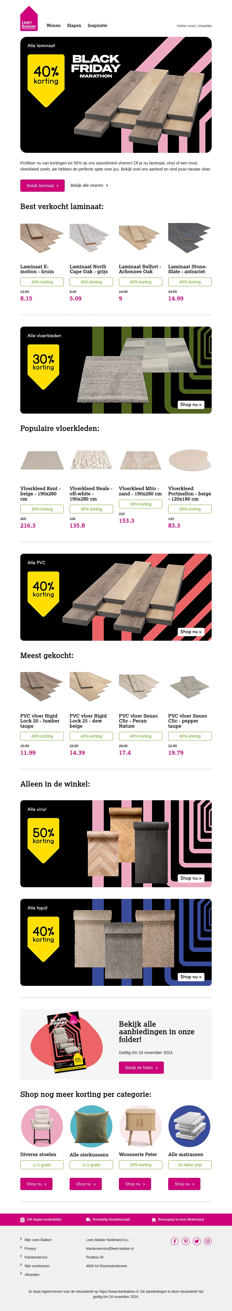Profiteer nu van kortingen tot wel 50% op een breed assortiment vloeren en vloerkleden bij Leen Bakker. Of je nu laminaat, PVC, vinyl of tapijt zoekt, wij hebben de juiste optie voor jouw interieur. Bekijk onze bestsellers en populaire keuzes.