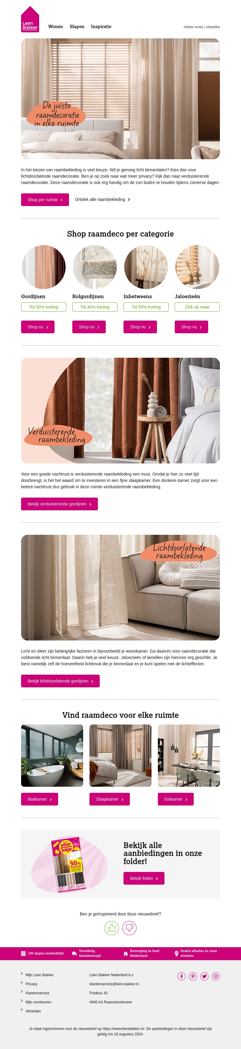 Verduisterende raambekleding zorgt voor een goede nachtrust. Bij Leen Bakker vind je een ruime collectie gordijnen, rolgordijnen, jaloezieën en meer. Of je nu op zoek bent naar lichtdoorlatende of verduisterende opties, wij hebben het allemaal. Ontdek nu onze aanbiedingen!