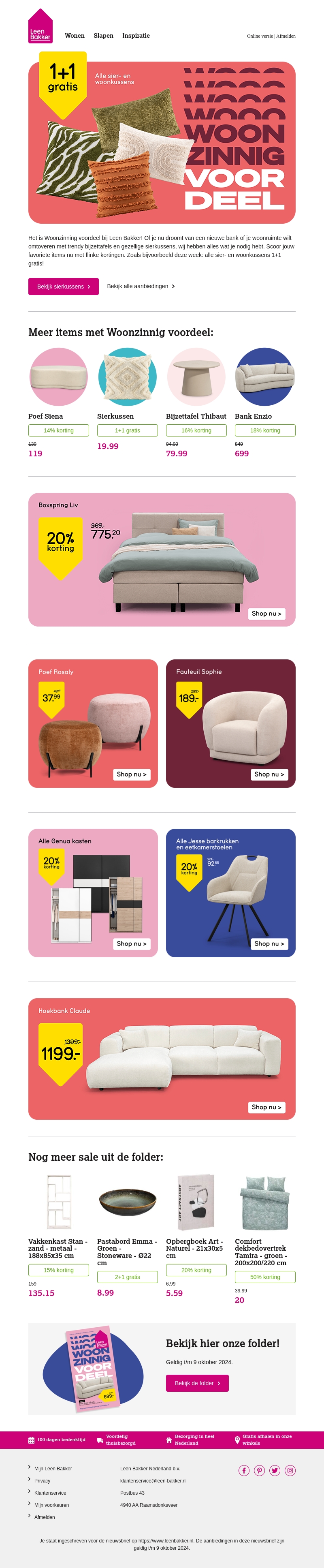 Woonzinnig Voordeel is terug bij Leen Bakker, met fantastische kortingen op een breed scala aan meubels en woonaccessoires. Van zitkussens tot boxsprings, er is voor ieder wat wils. Profiteer van aanbiedingen zoals '1+1 gratis' en kortingen tot 50%. Mis deze kans niet om je huis in te richten met stijlvolle items tegen betaalbare prijzen.