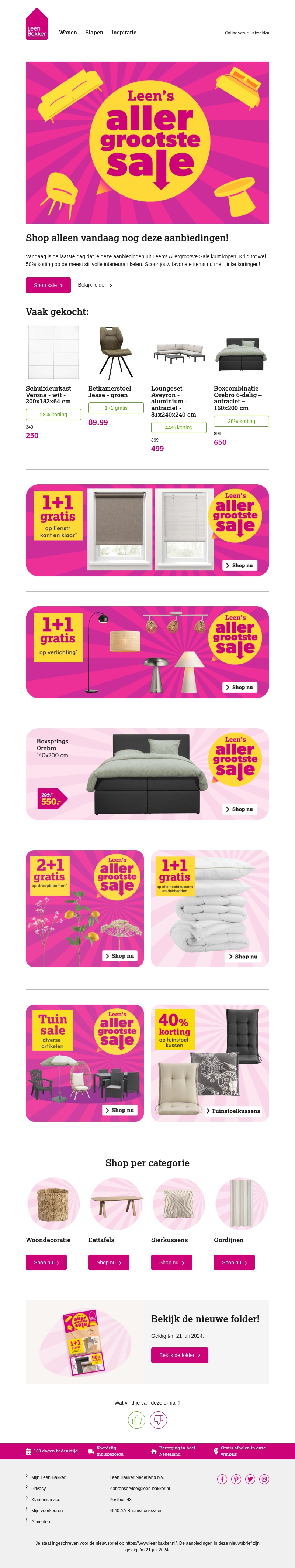 Vandaag is de laatste dag om te profiteren van Leen's Allergoedste Sale! Scoor kortingen tot wel 50% op een breed scala aan meubels en woonaccessoires. Mis het niet en shop nu! Bekijk ook onze 1+1 gratis acties voor nog meer voordeel.