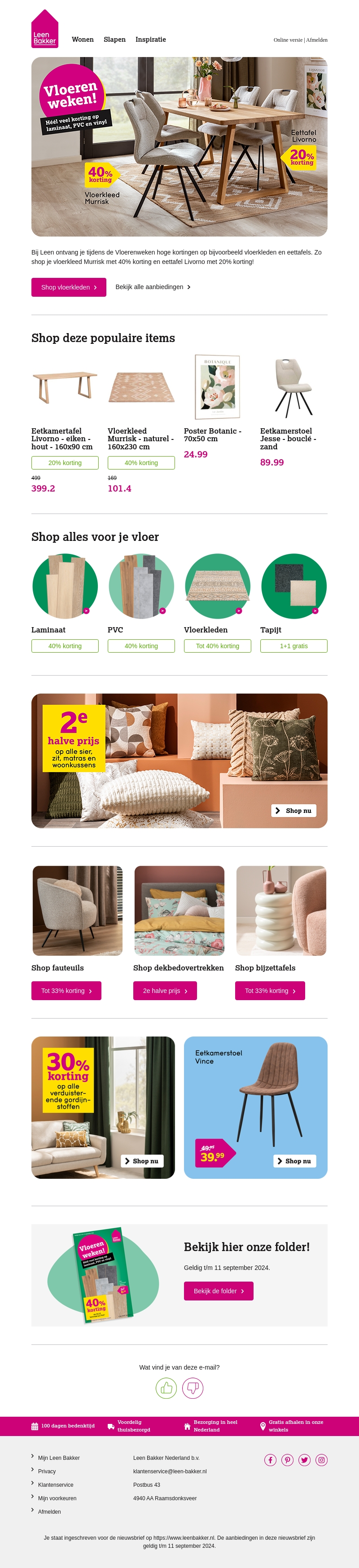 Profiteer van hoge kortingen tot wel 40% op vloerkleden, laminaat en meer bij Leen Bakker! Ontdek een breed scala aan populaire items voor je vloer, inclusief speciale aanbiedingen op eetkamertafels en stoelen. Bekijk alle deals nu en bespaar op je volgende aankoop.