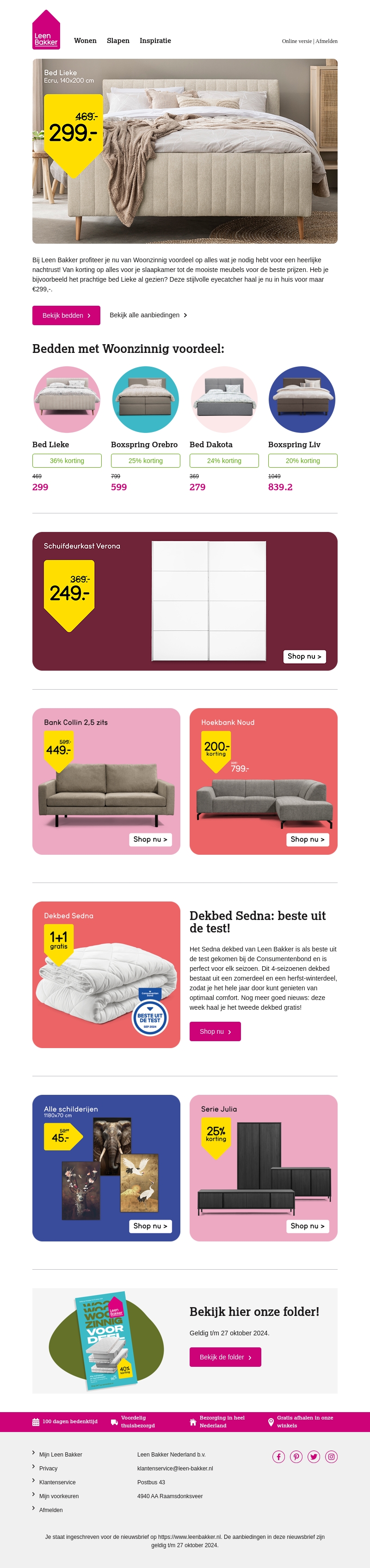 Ontdek het Woonzinnig voordeel bij Leen Bakker met Bed Lieke. Dit stijlvolle en comfortabele bed is nu verminderd in prijs van €469 naar slechts €299. Daarnaast zijn er prachtige kortingen op andere meubels zoals Boxspring Orebro en Schuifdeurkast Verona. Mis deze kans niet om je woonruimte stijlvol en betaalbaar in te richten.