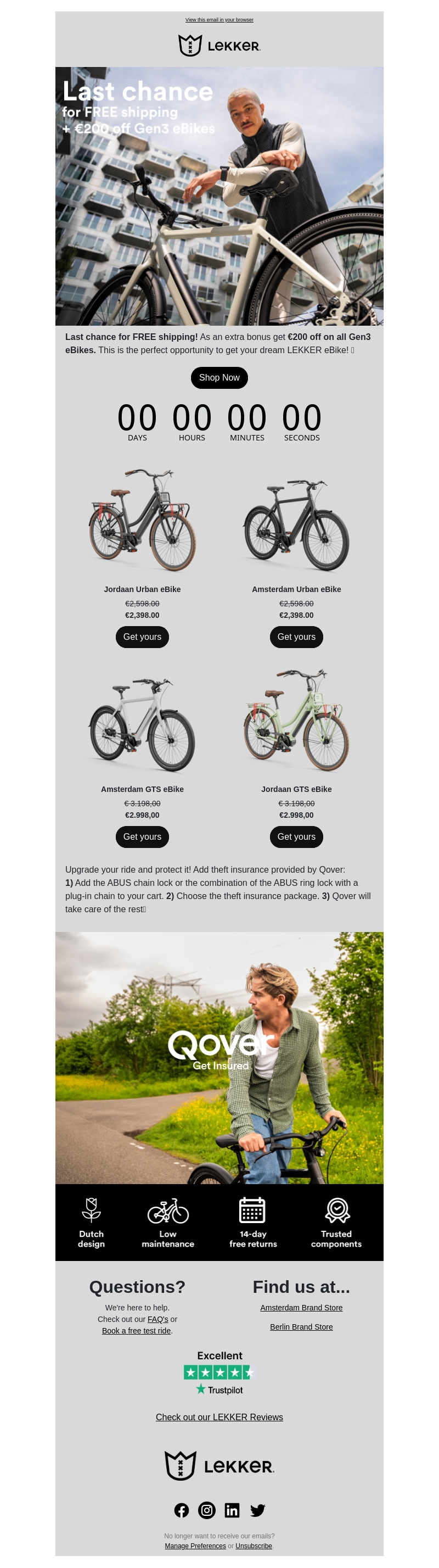 Mis deze kans niet! Ontvang gratis verzending en €200 korting op alle Gen3 eBikes van LEKKER. Upgrade je rit met stijlvolle en betrouwbare eBikes. Bezoek onze Amsterdam of Berlijn Brand Store, en ontdek meer over onze fietsinzichten met Qover diefstalverzekering.