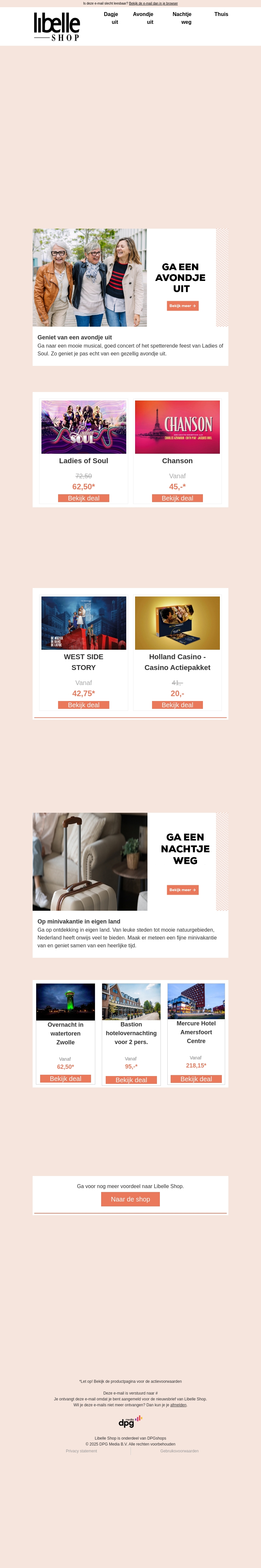 Profiteer van geweldige aanbiedingen voor een avondje uit met Libelle Shop. Ontdek kortingen voor evenementen zoals Ladies of Soul en Chanson. Overnacht voordelig in stijlvolle hotels en ervaar een romantische minivakantie in eigen land. Bezoek onze Libelle Shop voor meer informatie en deals.