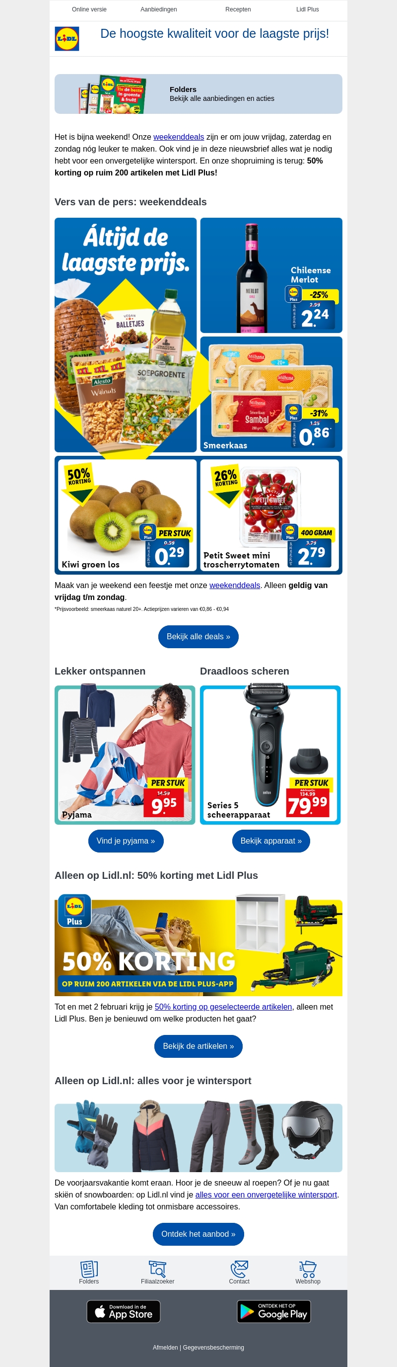 De nieuwste nieuwsbrief van Lidl Plus biedt een geweldige kortingsactie met maar liefst 50% korting op geselecteerde artikelen. Of je nu op zoek bent naar vers fruit, groenten of non-food deals, Lidl heeft het allemaal! Mis ook de weekenddeals niet met aantrekkelijke kortingen op populaire producten. Ontdek bovendien alles wat je nodig hebt voor een onvergetelijke wintersport. Download de Lidl Plus-app en begin vandaag nog met besparen!