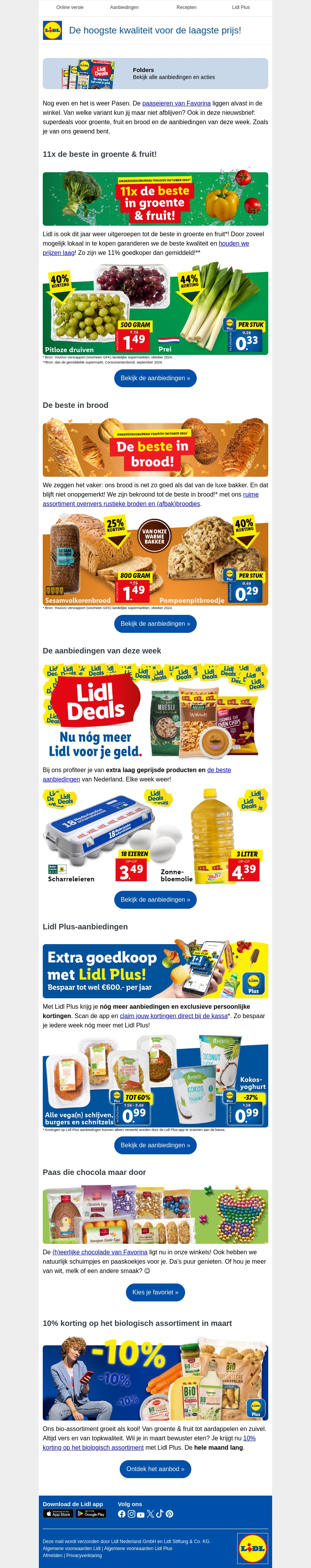 Lidl viert Pasen met geweldige aanbiedingen, waaronder 18 Beter Leven-scharreleieren voor slechts €3.49. Vind de beste deals in groente, fruit en brood, en geniet van extra besparingen met Lidl Plus. Vergeet niet te profiteren van de speciale paaschocolade en 10% korting op het biologische assortiment. Bezoek Lidl en ontdek meer fantastische aanbiedingen.