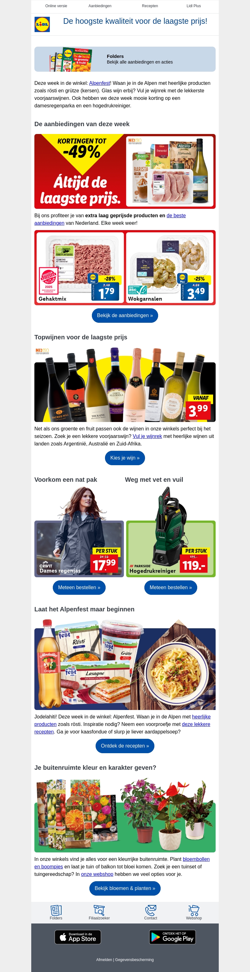 Deze week bij Lidl: geniet van Alpenfest met producten zoals rösti en grütze. Ontdek topwijnen uit diverse landen en profiteer van kortingen tot 49% op geselecteerde artikelen. Verder zijn er aanbiedingen voor damesregenkleding en hogedrukreinigers. Voeg kleur toe aan je buitenruimte met onze selectie planten.