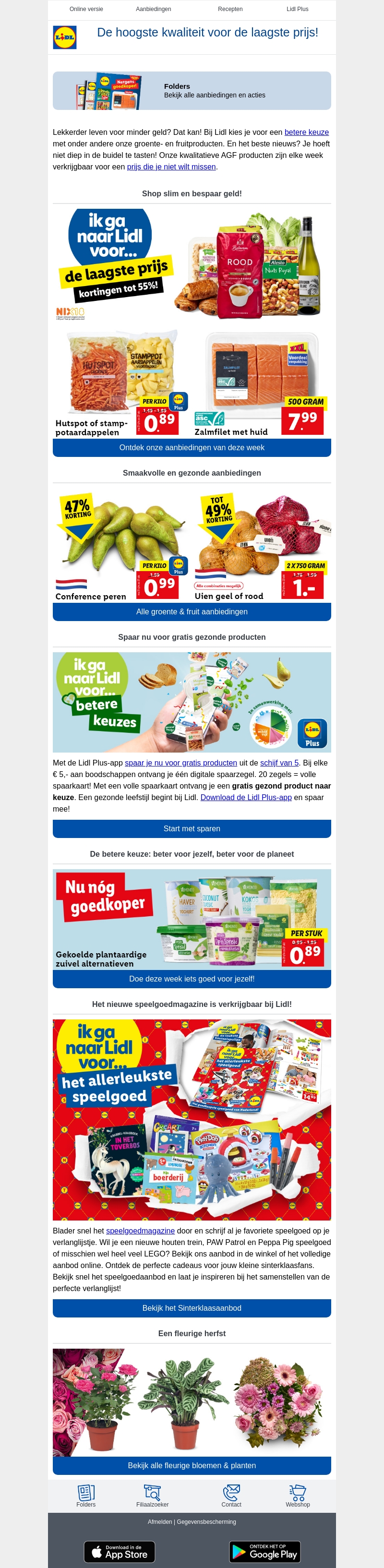 Bij Lidl vind je een gezondere eetstijl voor een lage prijs. Ontdek smakelijke aanbiedingen zoals vers fruit en groenten met hoge kortingen. Spaar nu voor gratis gezonde producten en geniet nog meer van voordelige prijzen met Lidl Plus. Het speelgoedmagazine is ook beschikbaar vol inspiratie voor de feestdagen.