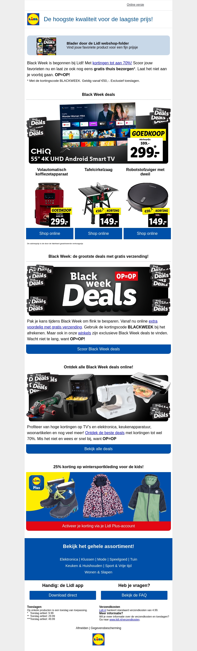 De Black Week is begonnen bij Lidl met kortingen tot 70%! Geniet van de beste deals en laat je aankopen gratis thuisbezorgen. Mis het niet, want OP=OP. Ontdek aanbiedingen op TV's, elektronica, keukenapparatuur en meer. Gebruik de kortingscode BLACKWEEK voor extra voordeel.