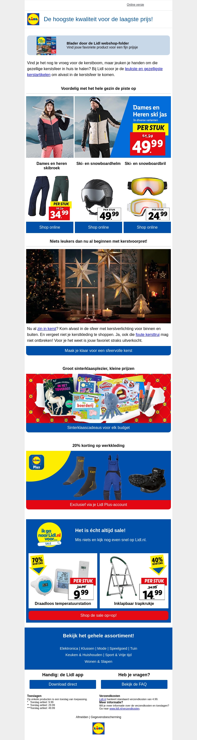 Bereid je voor op een gezellige kerst met onze voordelige decoraties. Lidl biedt de mooiste kerstartikelen om je huis sfeervol te maken. Van kerstverlichting tot kleding, alles is beschikbaar in onze webshop. Begin nu met het verzamelen van de beste deals voor de feestdagen.