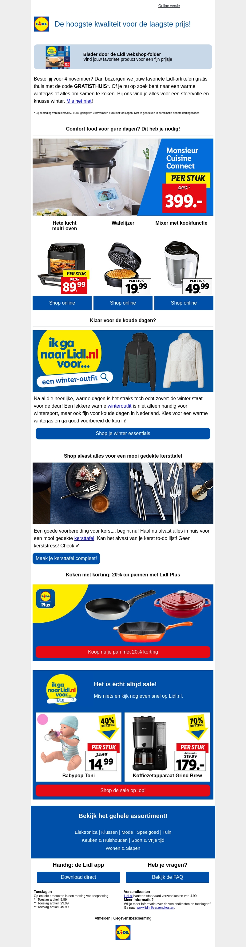 Haal je favoriete Lidl-producten nu eenvoudig in huis met gratis bezorging. Bereid je voor op de kou met onze warme winteroutfits en keukenapparaten. Mis onze exclusieve kortingen niet, zoals 70% op koffiemachines en 20% op pannen. Zorg dat je tijdig kerstklaar bent met onze sfeervolle tafelaccessoires. Vind alles wat je nodig hebt voor een knusse winter.