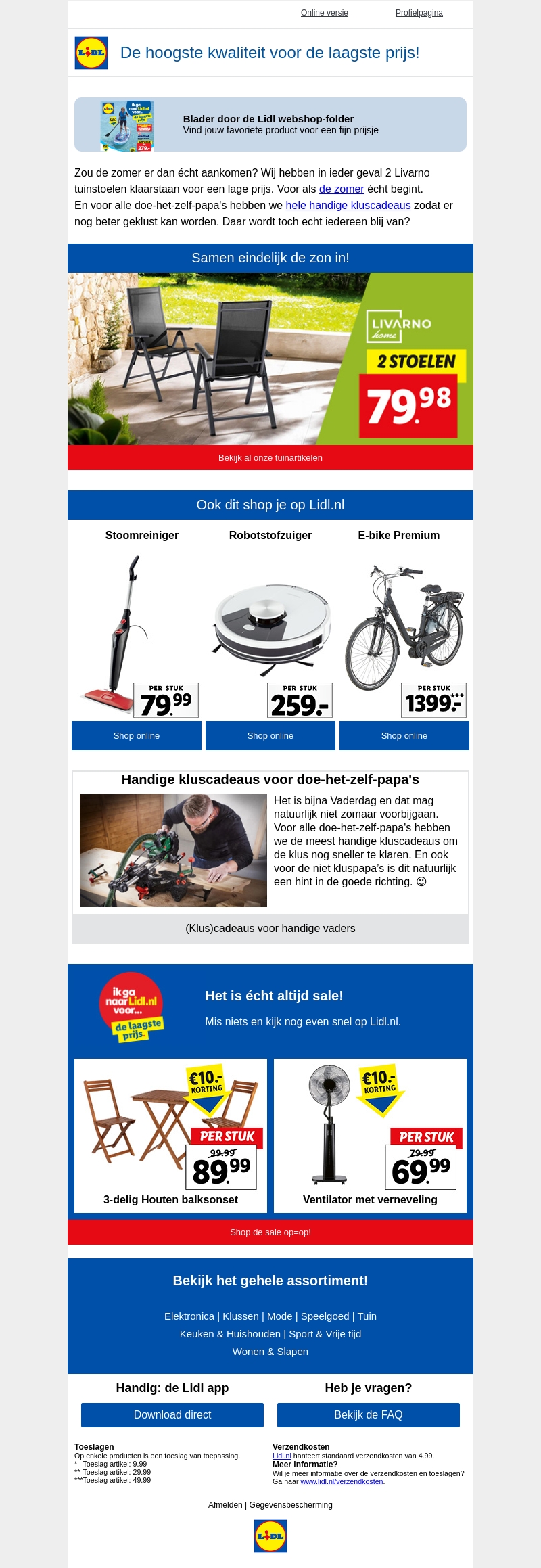 Zou de zomer er dan Γ©cht aankomen? Bij Lidl hebben we handige kluscadeaus voor alle doe-het-zelf-papaβs klaarstaan. Profiteer van onze exclusieve aanbiedingen en maak jouw vader blij met de beste kluscadeaus. Shop nu online en ontdek al onze tuinartikelen en elektrische apparaten.