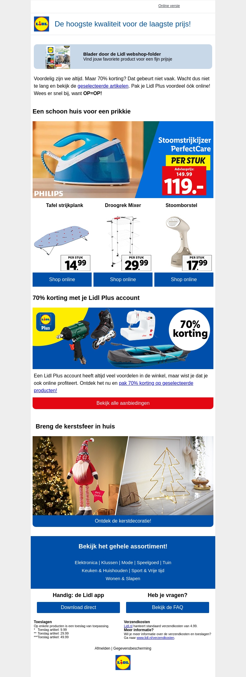 Profiteer van 70% korting met je Lidl Plus account. Bekijk de geselecteerde artikelen en koop ze voordelig online. Breng de kerstsfeer in huis met onze speciale decoraties. Vind producten van topkwaliteit voor een lage prijs. Mis deze unieke kortingen niet en winkel nu bij Lidl Plus!