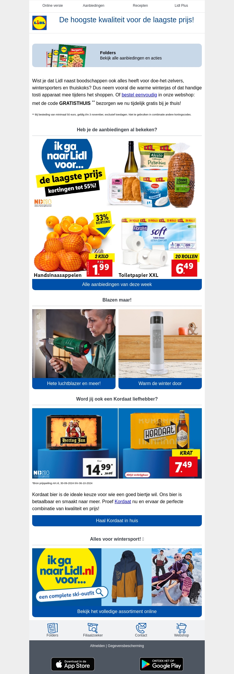 Lidl verrast je nu tijdelijk met gratis bezorging op al je online aankopen. Of je nu zoekt naar doe-het-zelf spullen, winterse kleding of vers fruit, Lidl.nl heeft het allemaal. Mis deze kans niet om comfortabel vanuit huis te shoppen en te profiteren van de laagste prijzen. Bekijk de folders voor extra kortingen tot 55%. Vergeet niet de code GRATISTHUIS te gebruiken bij je bestelling.