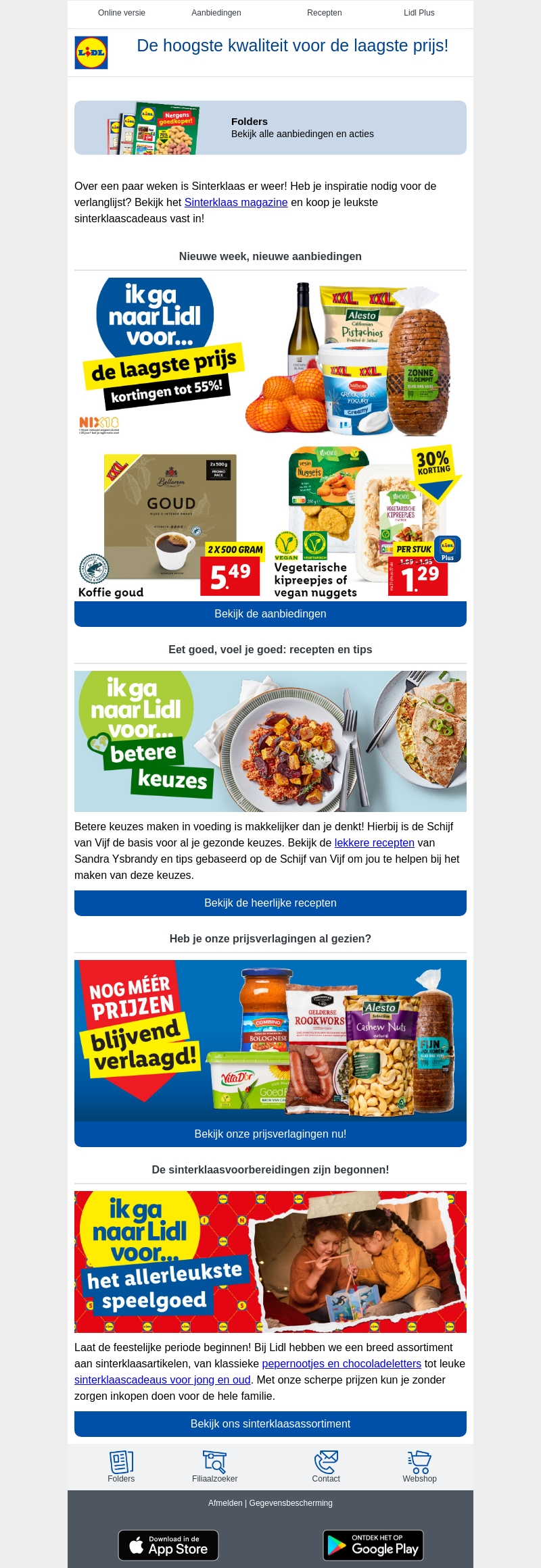 Bereid je voor op Sinterklaas met de beste cadeaus en aanbiedingen bij Lidl. Ontdek ons uitgebreide assortiment aan sinterklaasartikelen, van klassieke pepernootjes tot speelgoed voor kinderen van alle leeftijden. Profiteer van hoge kortingen en maak gebruik van Lidl Plus voor extra besparing. Vergeet niet onze gezonde recepten en blijvend verlaagde prijzen te bekijken. Begin de feestelijke periode goed voorbereid!