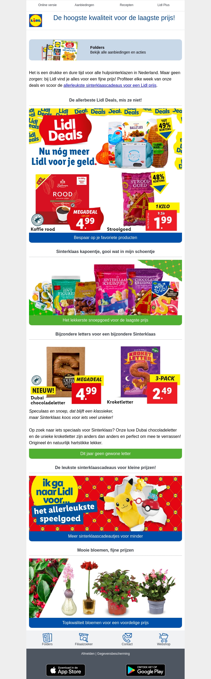 Het is de tijd van het jaar voor Sinterklaas en Lidl biedt verrassend veel voor een kleine prijs. Ontdek de beste deals zoals koffiemegadeals en nieuwigheidjes zoals de Dubai chocoladeletter. Bespaar met unieke lekkernijen en geniet van fijne prijzen op bloemen. Kom naar Lidl voor de leukste Sinterklaascadeaus.