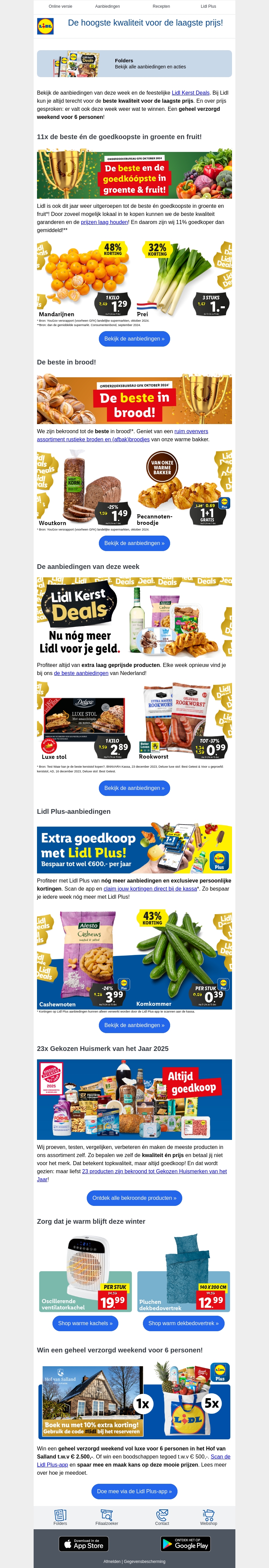 Beleef een geheel verzorgd weekend met 6 personen in Hof van Salland. Lidl biedt deze week de beste deals op voeding en huisproducten. Profiteer van kortingen en exclusieve aanbiedingen met Lidl Plus. Win daarnaast prachtige prijzen met onze speciale Kerst Deal actie.