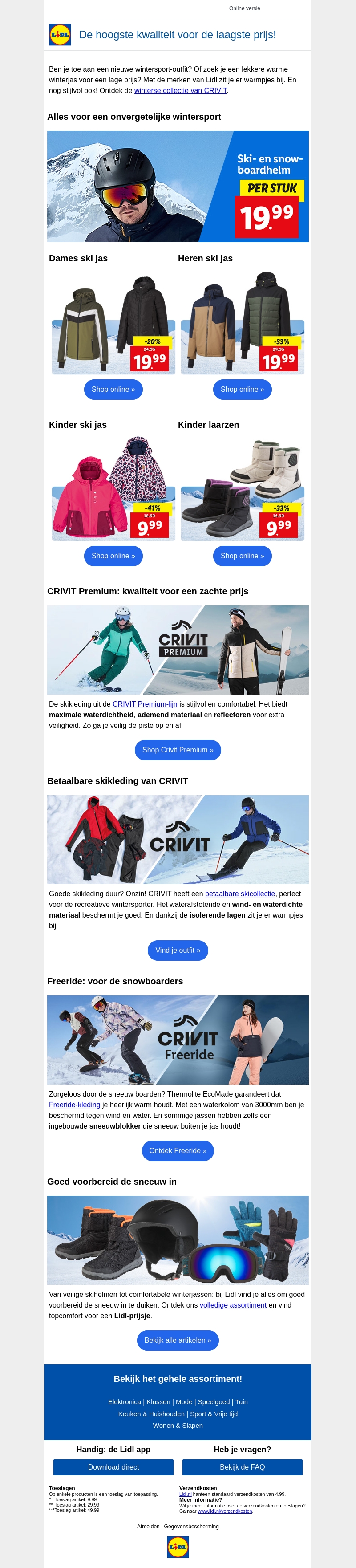 Ben je toe aan nieuwe wintersportkleding of warme winterjas? Bij Lidl vind je een complete wintercollectie van CRIVIT tegen zachte prijzen. Van ski-jassen tot kinderlaarzen, alles voor een onvergetelijke wintersport is hier beschikbaar. Shop de nieuwste items online en bereid je voor op de kou.
