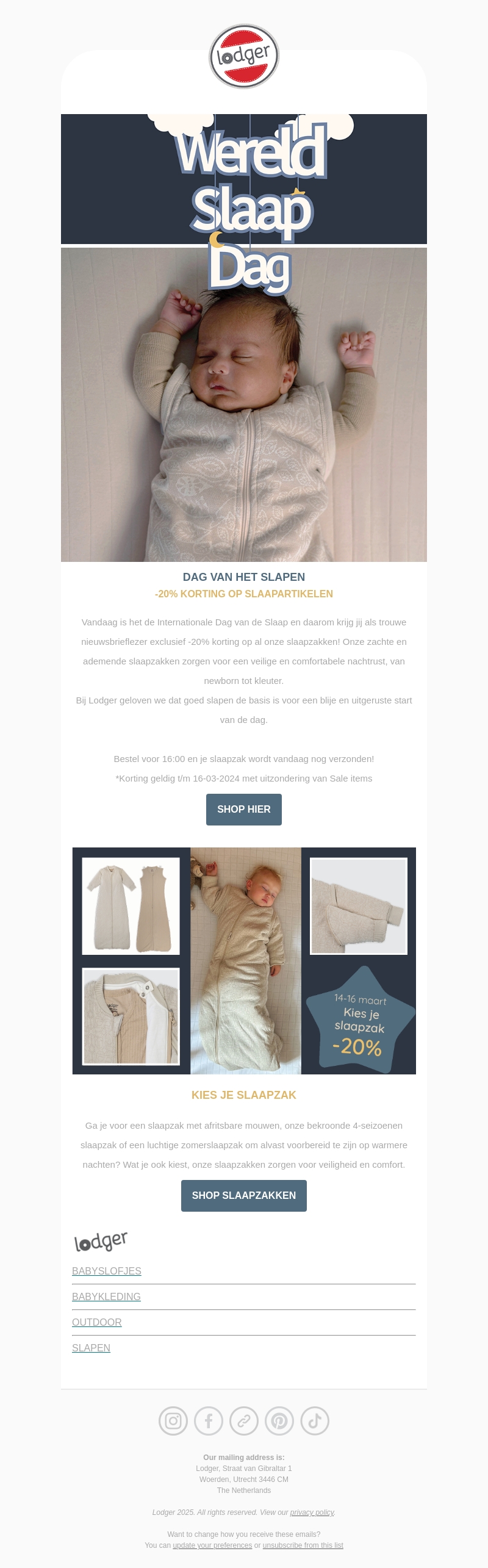 Vier de Internationale Dag van de Slaap met een exclusieve korting van -20% op alle slaappakken bij Lodger. Zorg voor een comfortabele nachtrust met onze zachte, ademende slaapzakken. Deze aanbieding geldt voor trouwe nieuwsbrieflezers tot 16 maart 2023.