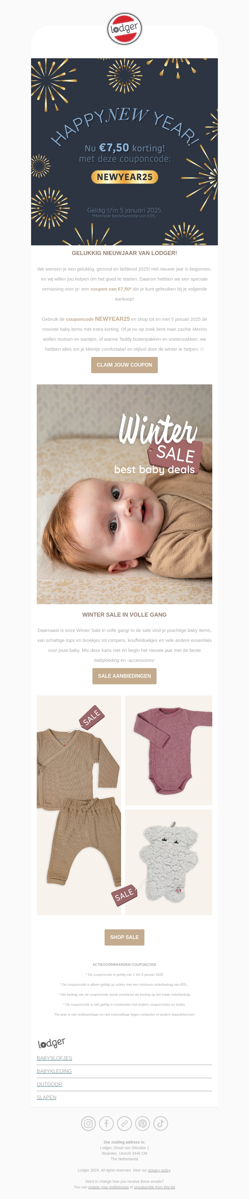 Vier het nieuwe jaar met Lodger! Ontvang €7,50 korting op je volgende aankoop met de code NEWYEAR25. Geniet van de beste winter deals voor je kleintje. De sale loopt tot en met 5 januari 2025. Koop knusse merino wol jassen en meer. Mis deze kans niet!