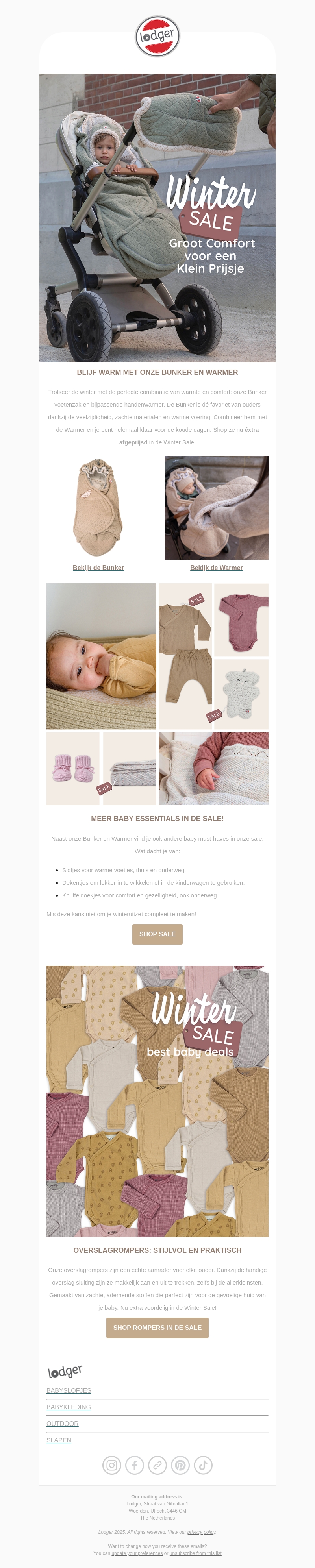 De Lodger Winter Sale biedt geweldige deals op essentiële babyproducten. Geniet van comfort met de Bunker en Warmer, ontworpen voor warmte en zachtheid. Vind daarnaast slofjes, dekentjes en knuffeldoekjes in de aanbieding. Mis de kans niet om je winteruitrusting compleet te maken.