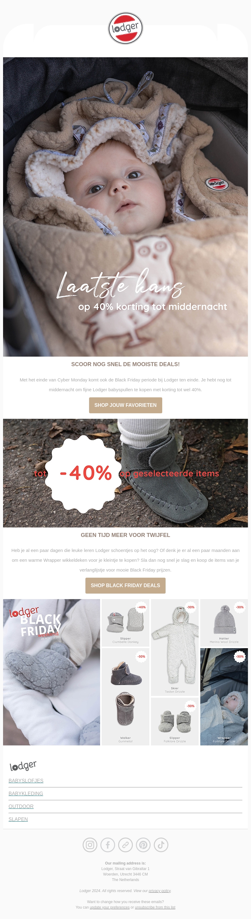 Het is je laatste kans om te profiteren van de fantastische Cyber Monday aanbiedingen bij Lodger. Krijg tot 40% korting op geselecteerde items, waaronder schattige babymode en zacht beddengoed. Mis deze unieke kans niet voordat de aanbieding afloopt om middernacht. Shop snel je favorieten en maak je babyuitzet compleet. Bezoek onze website voor de beste deals van het jaar.