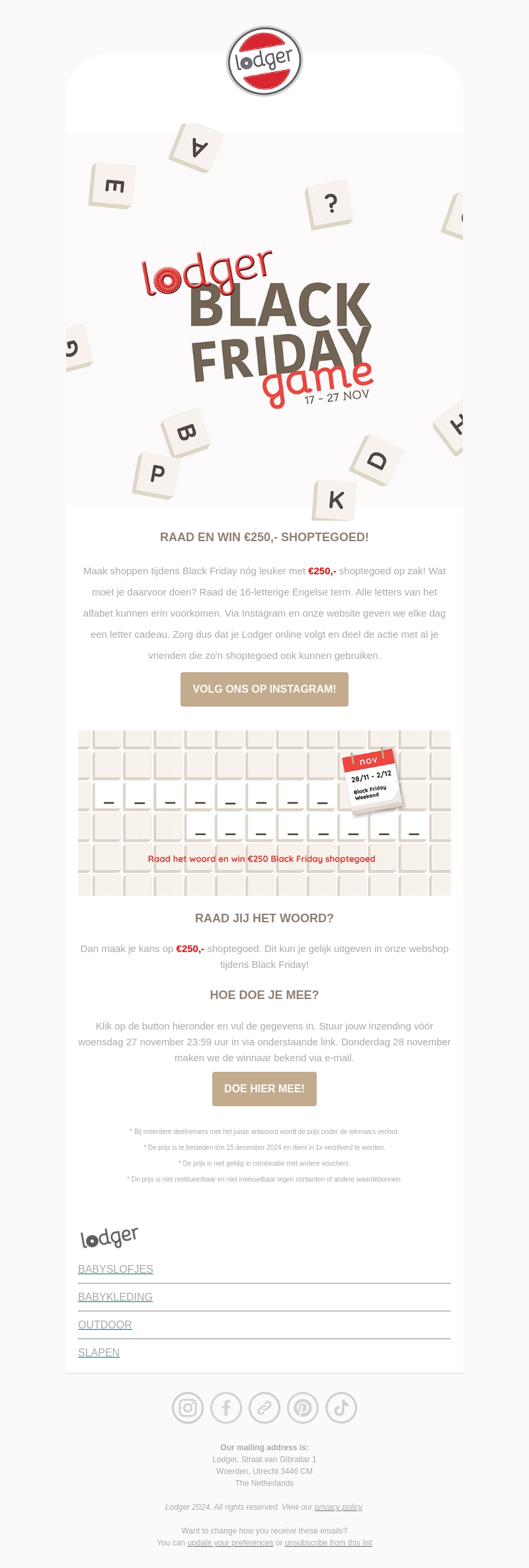 Neem deel aan de spannende Lodger Black Friday game en maak kans op €250,- shoptegoed. Raad de 16-letterige Engelse term, waarbij alle letters van het alfabet zijn toegestaan. Volg ons op Instagram voor dagelijkse hints. Deel de actie met je vrienden en vergroot jullie kans. Doe mee voor 27 november en wie weet win jij!