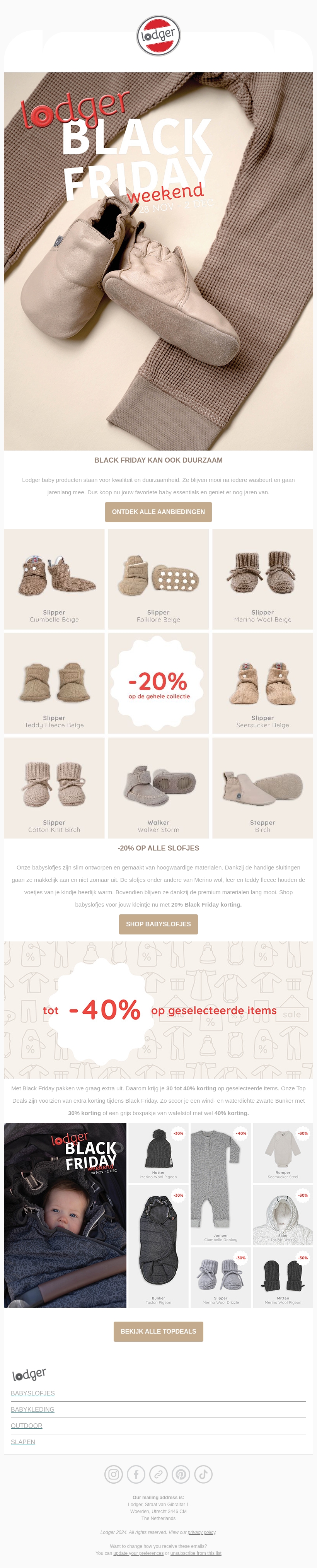 Ontdek de duurzame en voordelige collectie van Lodger tijdens Black Friday. Geniet van hoge kortingen op babykleertjes en accessoires, allemaal ontworpen met oog voor kwaliteit en duurzaamheid. Ervaar comfort en stijl met korting, inclusief 20% op alle slofjes en tot wel 40% op geselecteerde items. De perfecte gelegenheid om essentials voor je kleintje aan te schaffen!