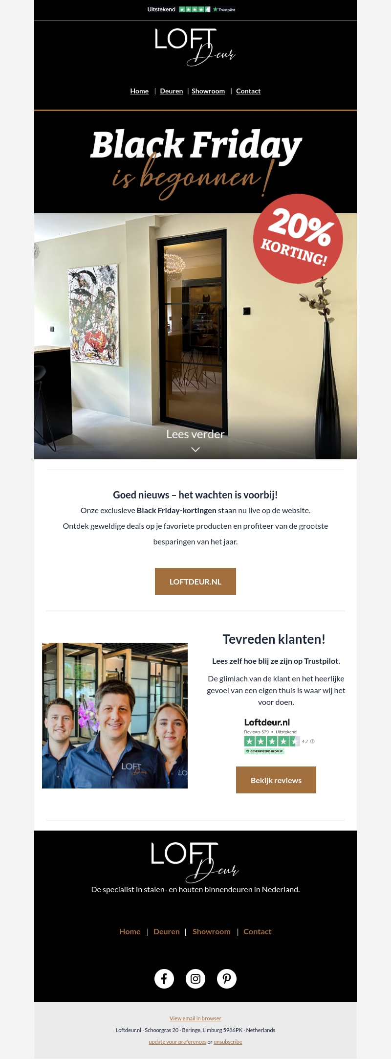 De Black Friday-deals van Loftdeur zijn live! Profiteer nu van 20% korting op een breed scala aan stalen en houten binnendeuren. Deze exclusieve aanbiedingen helpen je om je huis te upgraden met stijlvolle deuren tegen een gereduceerde prijs. Bezoek onze website voor meer informatie en ontdek hoe tevreden onze klanten zijn. De glimlach van een klant is onze belangrijkste missie.