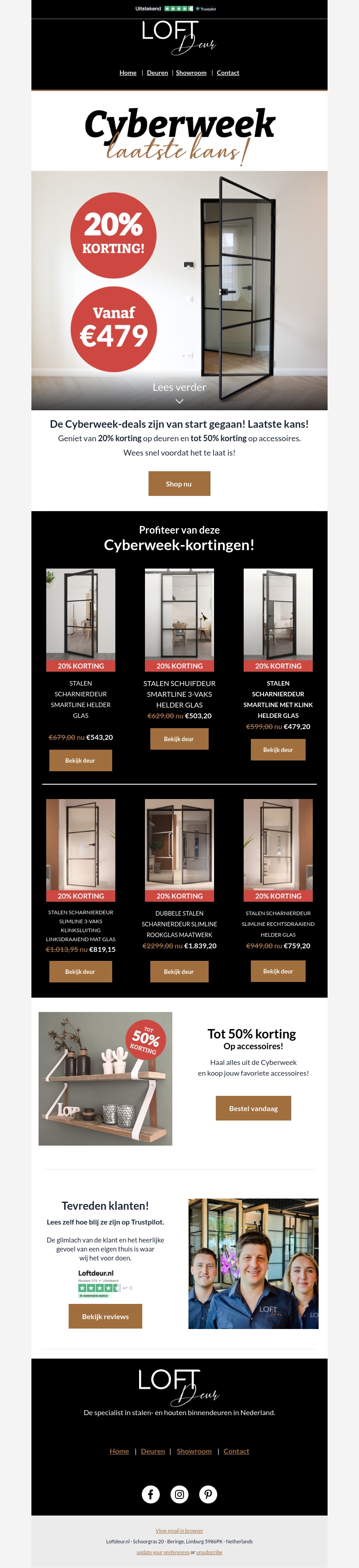De Cyberweek-deals zijn begonnen! Profiteer nu van 20% korting op deuren en tot 50% korting op accessoires. Bekijk onze stalen deuren al vanaf β¬479. Lees snel verder en mis deze unieke aanbiedingen niet. Klanttevredenheid staat bij ons voorop, lees de reviews op Trustpilot en shop jouw favorieten.